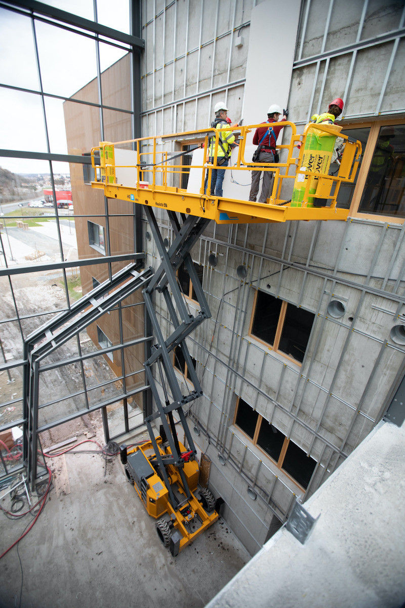 Die Plattformen der Scheren-Arbeitsbühnen von Haulotte bieten Platz für 3 Personen. Auch in Arbeitshöhen von bis zu 14 Metern ist maximale Sicherheit und Flexibiltät garantiert. Die Standard-Plattform-Verlängerungen sorgen für noch mehr Platz und zusätzliche Ausladung.