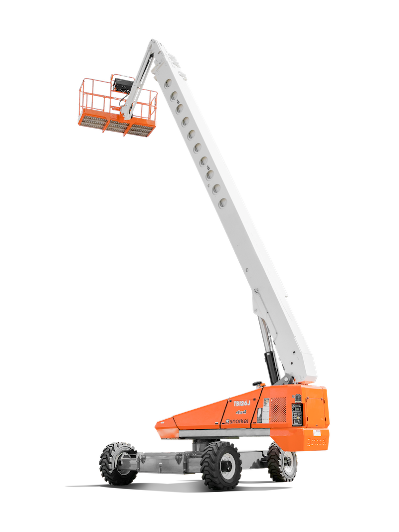 Die Snorkel T120 besitzt eine Arbeitshöhe von 36,6 m und eine seitliche Reichweite von 17,2 m. Entwickelt für Baustellenarbeit, Allradantrieb zu Standard zusammen mit einer festen Vorderachse und einer ausschiebbaren Hinterachse. Für zusätzliche Beweglichkeit empfehlen wir die T126J, eine gleiche Maschine aber mit einem 2 m langen Korbarm, hat sie eine Arbeitshöhe von 40 m und ein seitliche Reichweite von 19,2 m.