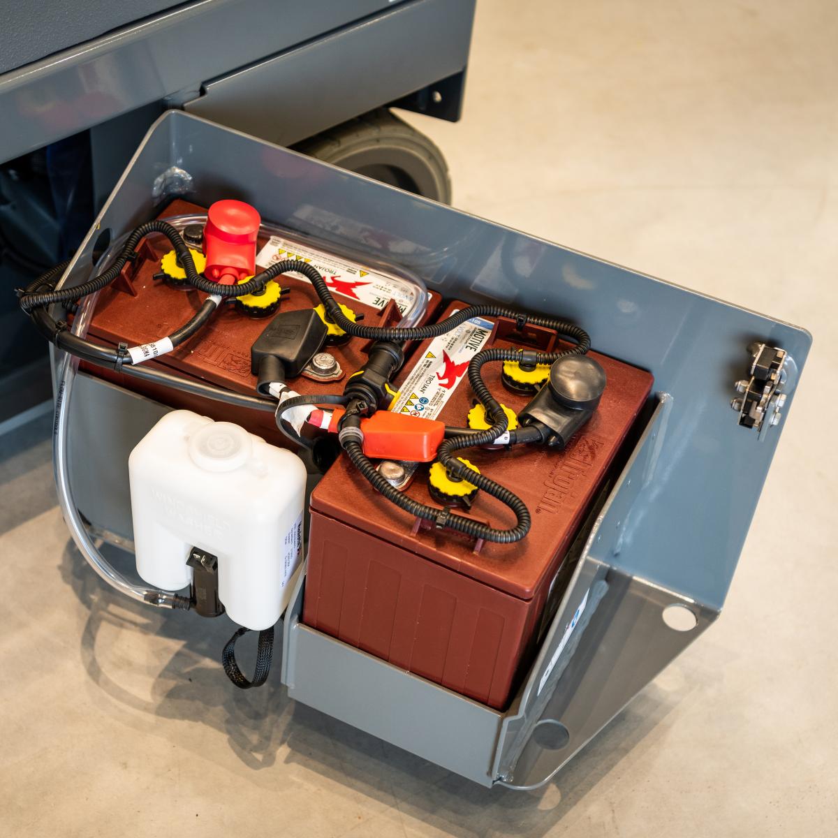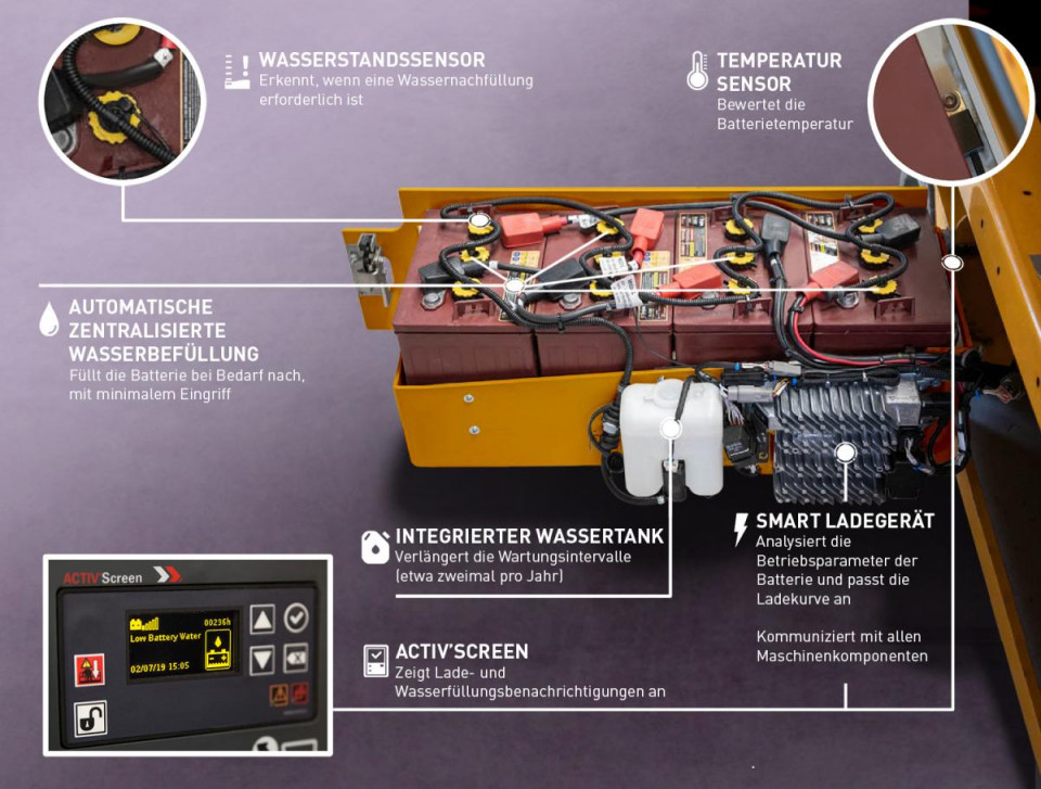 Haulotte Activ’Energy Management optimiert die Leistung und Lebensdauer Ihrer Batterien ! Diese exklusive Technologie kombiniert ein intelligentes Ladegerät mit Lösungen zum Nachfüllen von Wasser, um Ihre Kosten für die Wartung und den Austausch von Batterien erheblich zu reduzieren.