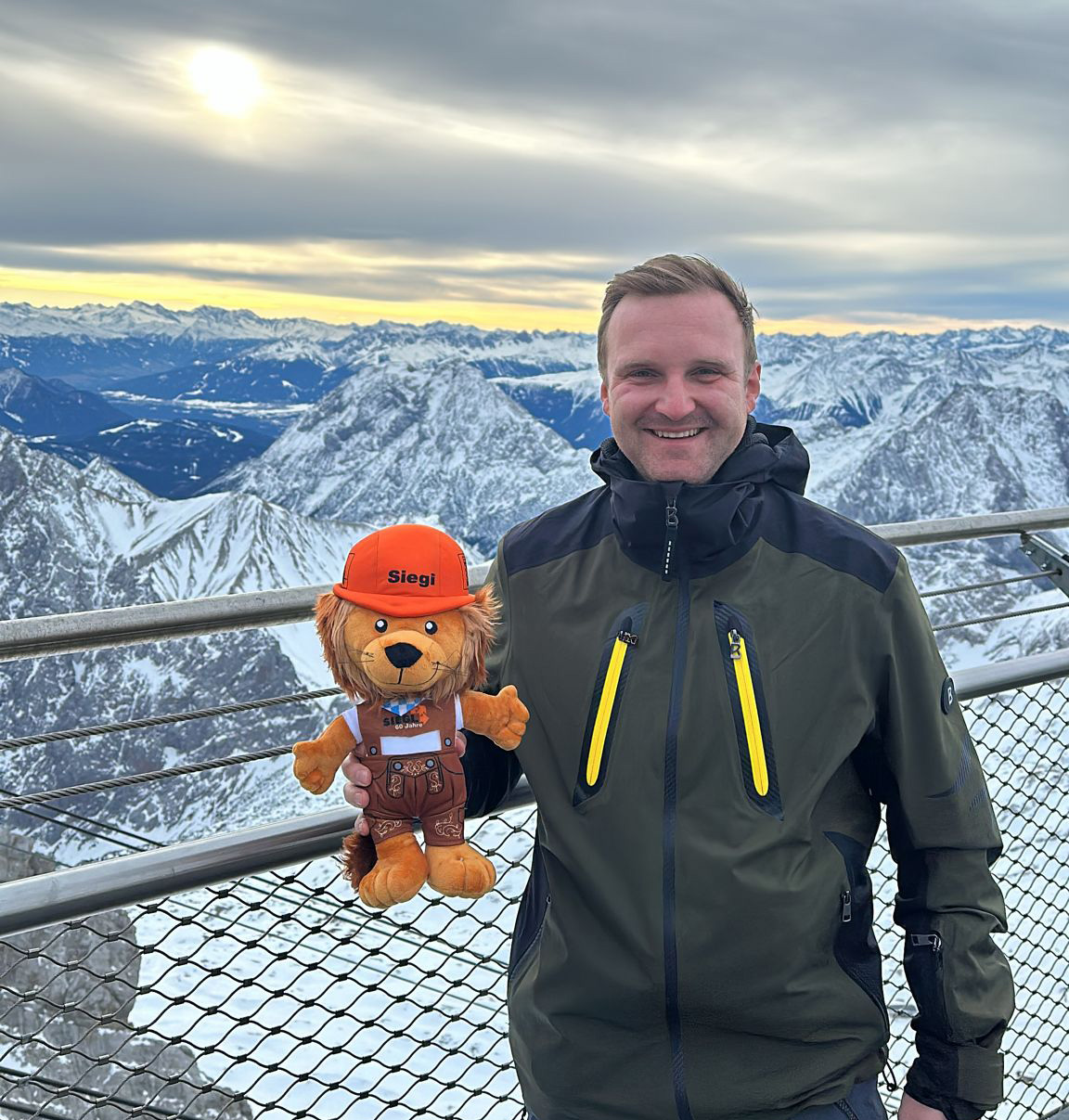 Unser SIEGI ist Bergsteiger! Gemeinsam mit Renz Burkert, Geschäftsführer unseres Partners, der AIM München Vertriebs GmbH aus Dachau, bestieg der kleine Löwe den höchsten Berg Deutschlands, die Zugspitze.